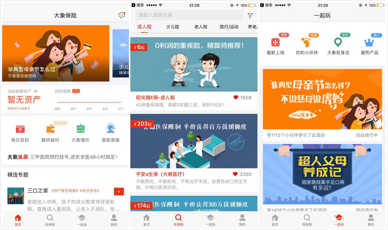 大象保险APP中提供投保建议、保险网购等功能,APP注册用户量约100万,2016年实现保费1000万,推出了包含健康险、少儿险、意外险、旅行签证险以及财产险的100余种产品。