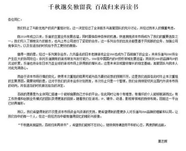 天津卡乐实际控制人、乐道互动CEO葛志辉也于今天发布内部信,表示“由于资本市场行情的变化,使得本次重组的结果可能与各方最初设想的预期不符,这是我们选择在此时终止本次重组的主要原因。”