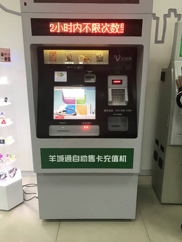 除了银行卡充值和人工充值,羊城通也有现金自助充值售卡设备(见下图),目前在市内有100多个地铁站已铺设现金自助充值设备。客户可使用50元和100元两种面值人民币为羊城通卡充值,省却了在网点排队或忘带银行卡的烦恼。