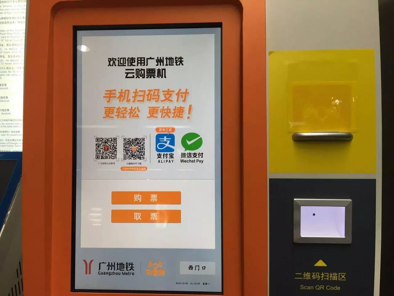 也可以在广州地铁微服务公众号,或支付宝-城市服务,选择购票,按提示操作,然后到云购票机扫码领票。