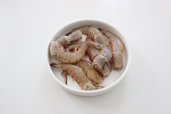 3.虾洗净,剪掉虾头1/2,去掉虾须,用剪刀在虾背剪开,把虾线去掉清洗干净