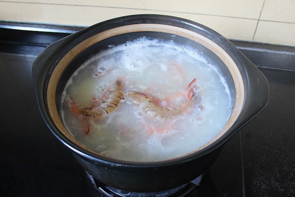 6.然后依次加入姜片,螃蟹和虾,中途可以多次用勺子搅拌,小火熬至20-25分钟至熟,最后加少许盐即可(喜欢软绵的可以熬的时间再长一点,或者高压锅直接上 哈哈)