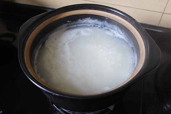 5.砂锅中加入大米和水,一勺香油,煮至米粒开花(其间用勺子不断搅拌大米防止粘锅)