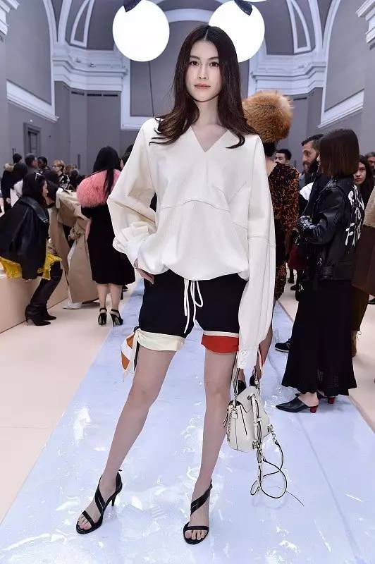 ▲这身造型示范对于瘦身需求人士来说也很适用:灯笼袖上衣遮手臂,拼色系带短裤凸显大长腿,小巧的Chloé白色麂皮迷你双肩包让造型更显灵动。超模演绎的造型么,则是白到发光了有木有?!