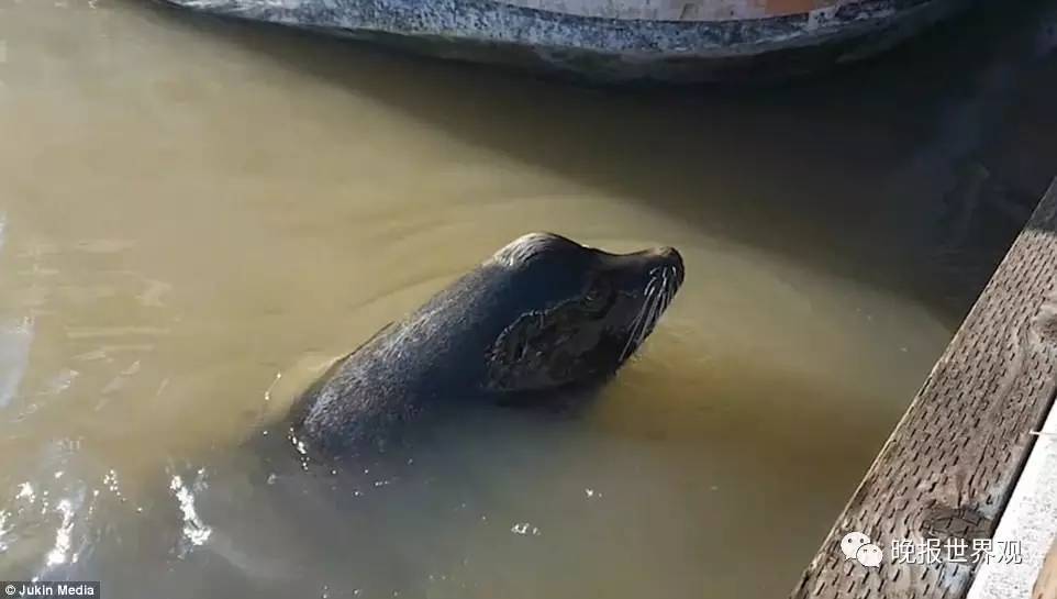 小女孩放松了警惕,背对海狮坐到码头边的围挡上,不料海狮又突然从水中跳出,将她拽入水中。
