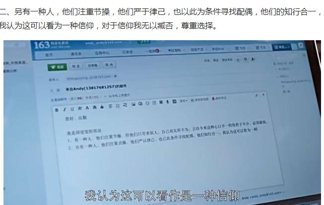 先看安迪那封写给应勤的邮件,将应勤的处女情结解读为一种信仰:他们在严于律己的基础上,也以此条件寻找配偶。安迪最后选择尊重应勤的信仰。