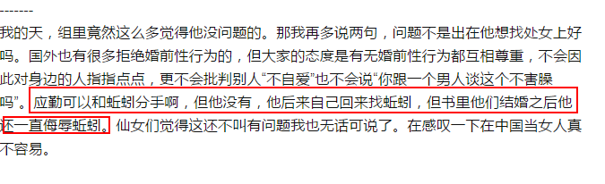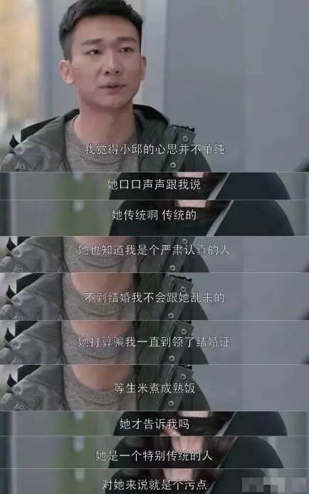 用关关的话说,邱莹莹在这件事情没有错。只是她与传统刻板的应勤并不适合。事后的剧情发展也说明了这点,一吵架就拿“不是处女”出来说事。应勤过不了自己那关,还跟邱莹莹结婚,这才是真渣↓