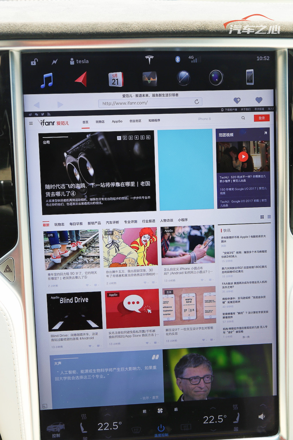 一方面,这块屏幕是各种功能汇聚和展示的良好介质,音乐、导航、后置摄像头、甚至一个全功能浏览器都可以在这里找到,由于特斯拉提供了一块终身免费的流量卡,所以闲暇时用它上网也是个不错的选择。