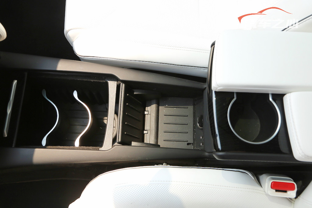 在储物空间上,Model X 的处理相当随意,最前侧的空间可以用隔板排出空间布局,中间翻盖处可以摆放手机,中央扶手中还有两个杯托。同样,这些位置缺乏精致感,两个储物空间之间居然还可以卡住东西。