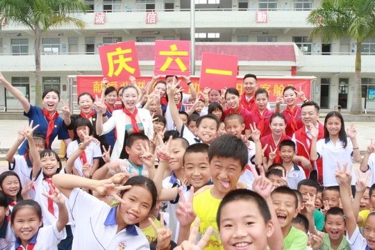 图:空姐们和饶平县浮山镇东官小学的学生们提前度过了一个愉快的“六一”节