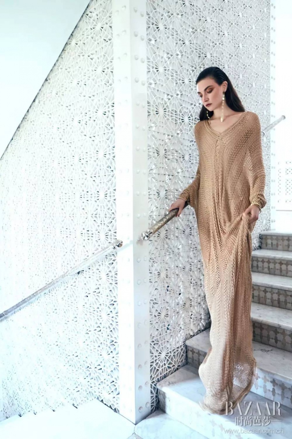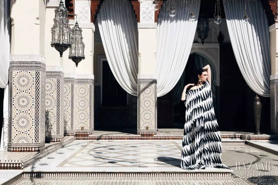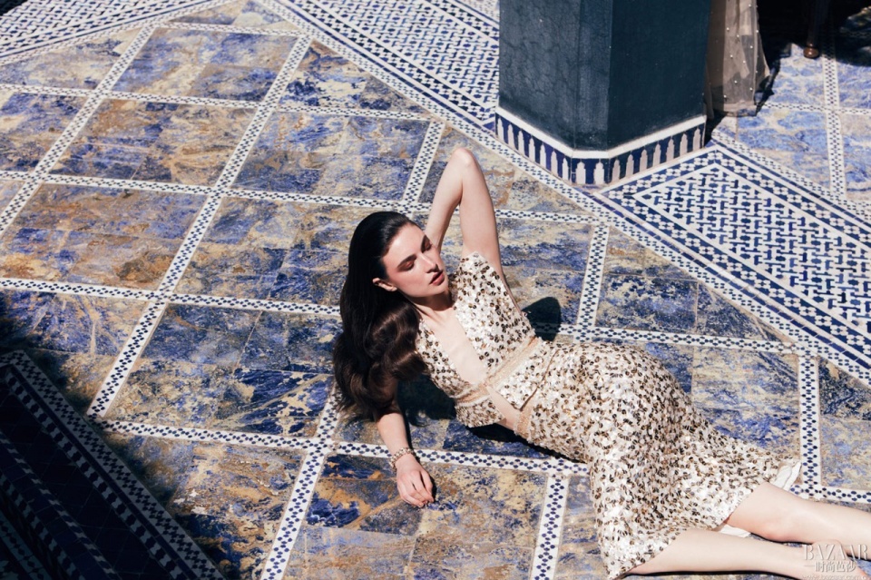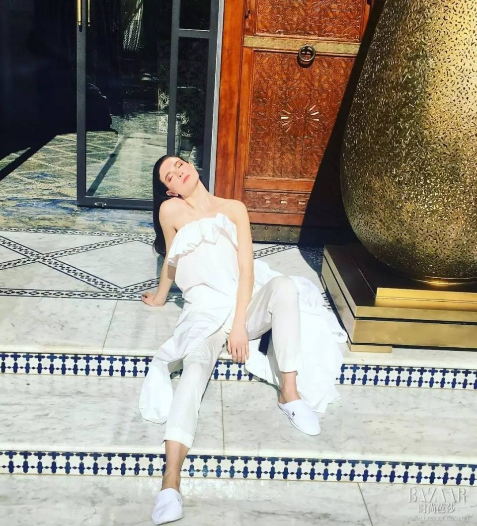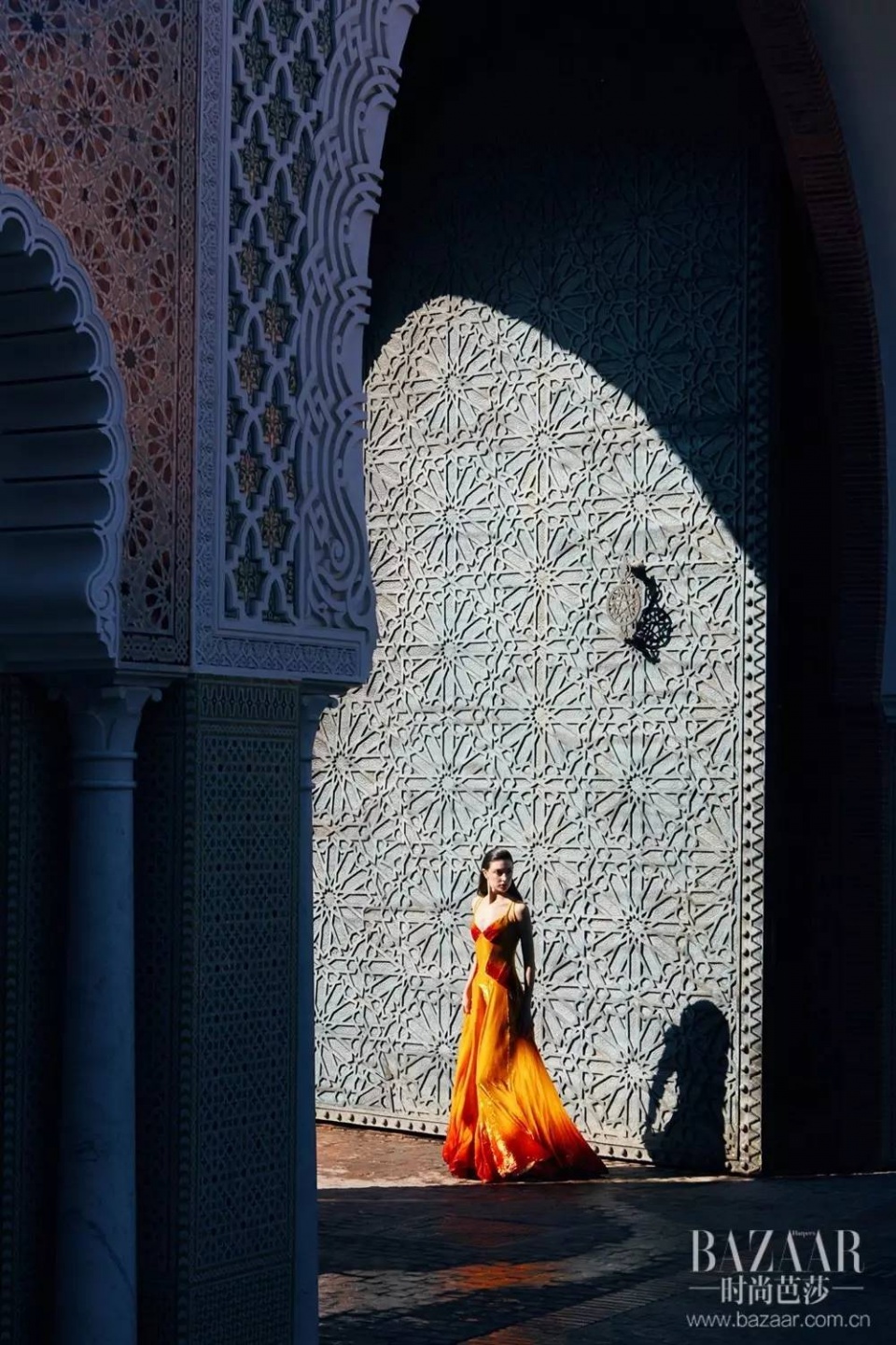 太好玩了!很多年前我来过一次摩洛哥,后来总想着再来一次可是一直没有机会。所以当他们告诉我这次拍摄的地点时我真的特别兴奋。到达的那天我和BAZAAR团队一起去了马拉喀什最著名的集市,我买了三条巨大的地毯。编辑们还把拍摄用的摩洛哥式拖鞋送给了我,还带我吃了非常美味的当地晚餐,拍摄的地点Royal Mansour酒店也美极了。我很喜欢那些颜色鲜艳的花砖,正好我自己的家也在重新装修,可能我也会在家里装饰一些吧。