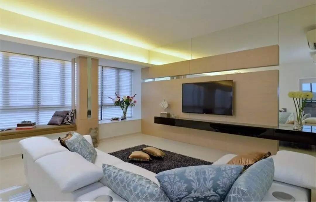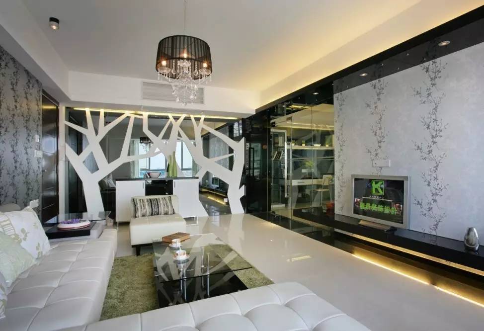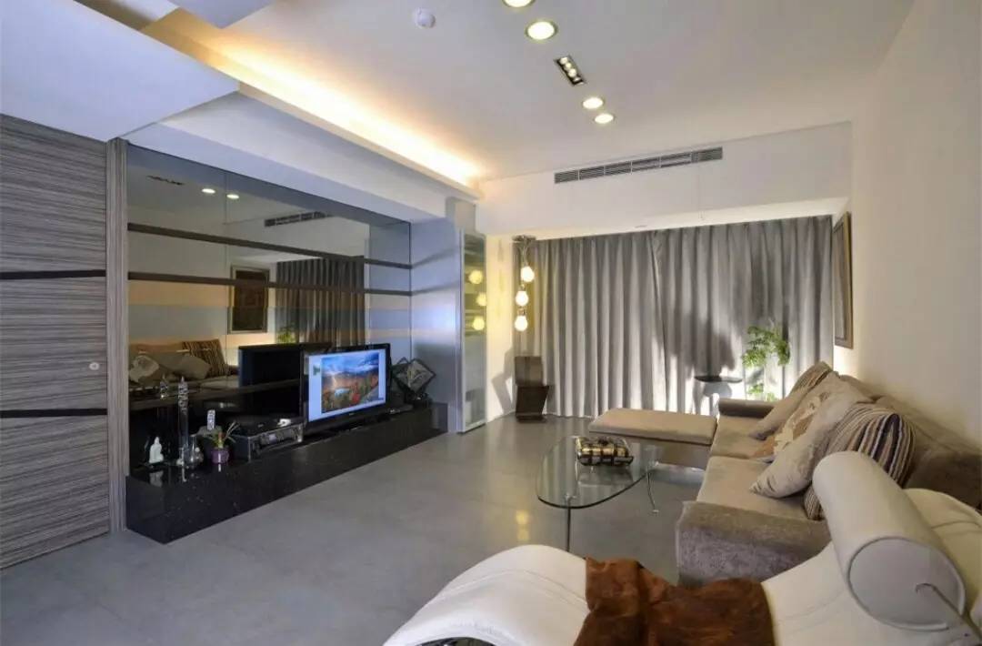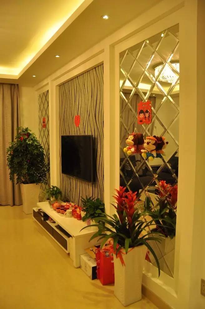 在电视墙周边装屏风造型,并在屏风后方装玻璃镜面,这样做可以利用镜面让客厅显得更明亮宽敞,而且又不会影响到坐在沙发上时看电视的视线,也是相当不错的电视墙装饰方案;