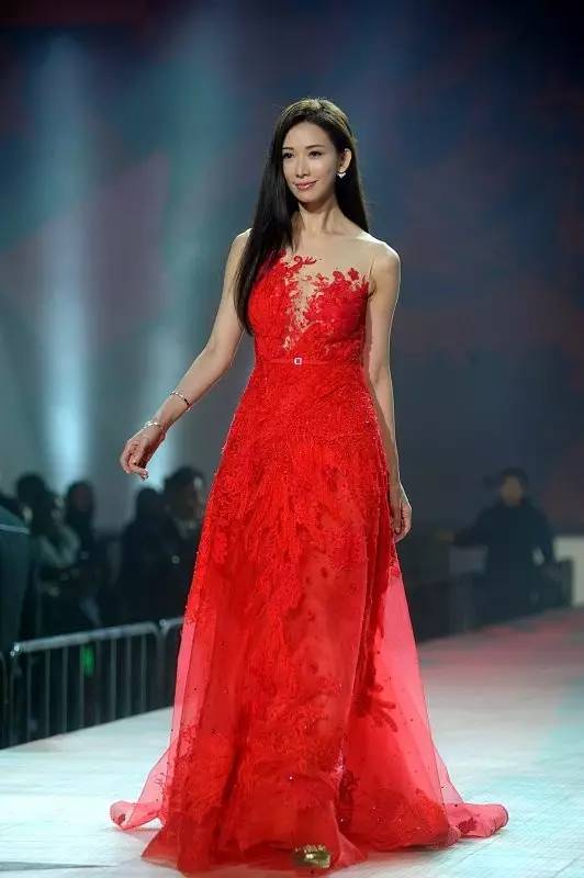 ▲蔡少芬身穿红色蕾丝刺绣透视拽地礼服裙,优雅迷人。