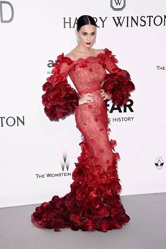 ▲凯蒂·佩里(Katy Perry)身着Marchesa红色花朵蕾丝露肩鱼尾曳地礼服,配戴亮钻耳饰,冷艳高贵。