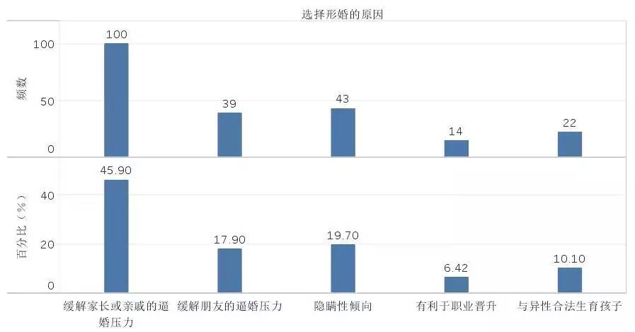同性恋者不仅很少敢向家长出柜,更有接近一半的比例会为了缓解家长、亲戚的逼婚压力而选择形婚,另有19.2%的同性恋者会为了隐瞒自己的取向而形婚。