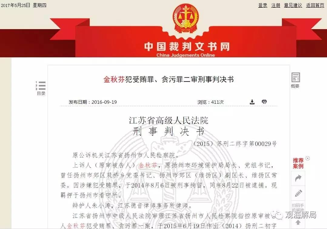 法晚·观海解局(微信ID:guanhaijieju)记者从中国裁判文书网上获悉,被认为是季建业最知名情妇的扬州环保局原局长金秋芬,因犯贪污受贿罪,于2016年6月2日被江苏高院二审判处有期徒刑6年,并处罚金45万元。