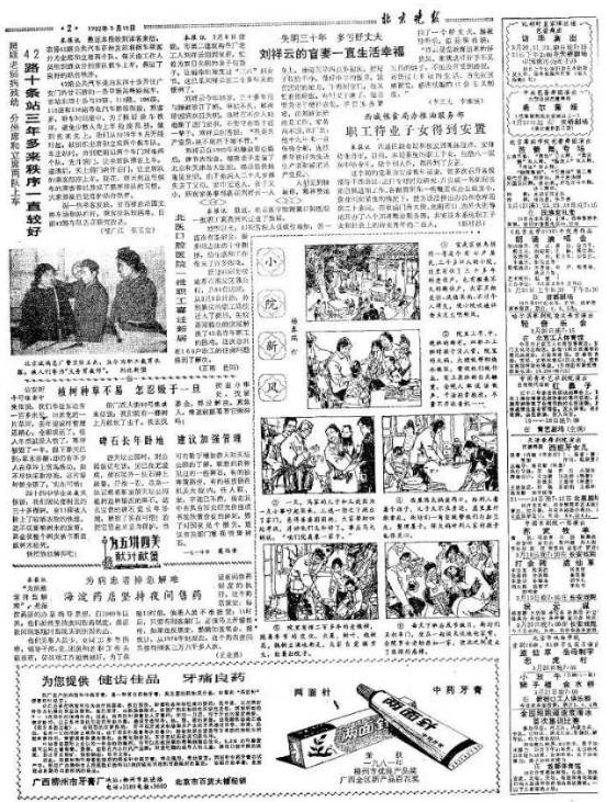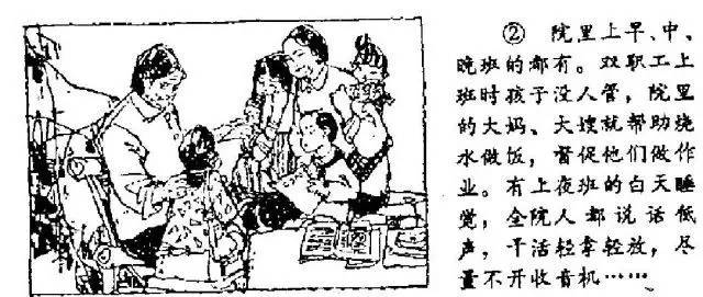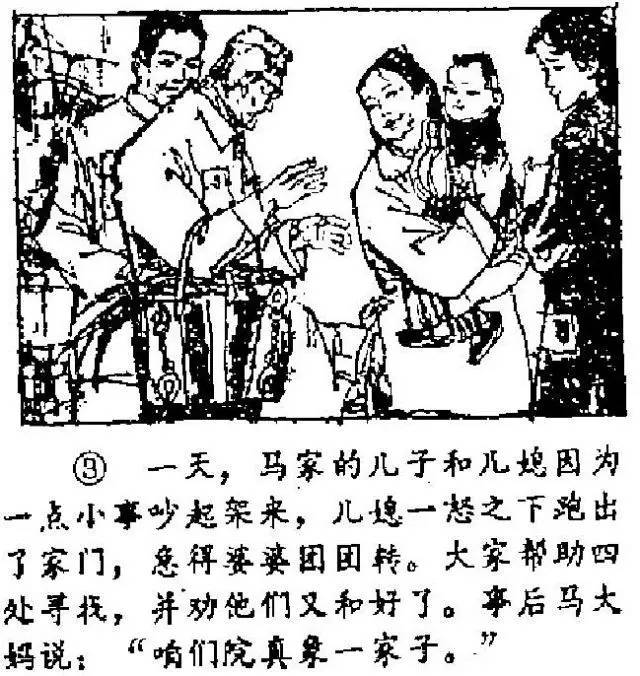 “一天,马家的儿子和儿媳因为一点小事吵起架来,儿媳一怒之下跑出了家门,急得婆婆团团转。大家帮助四处寻找,并劝他们又和好了。事后马大妈说:‘咱们院真像一家子。’”这是连环画《小院新风》第三幅的配文,刊登在1982年的报纸上。画面中,一个年轻女子抱着孩子,旁边的老少们正在劝她。