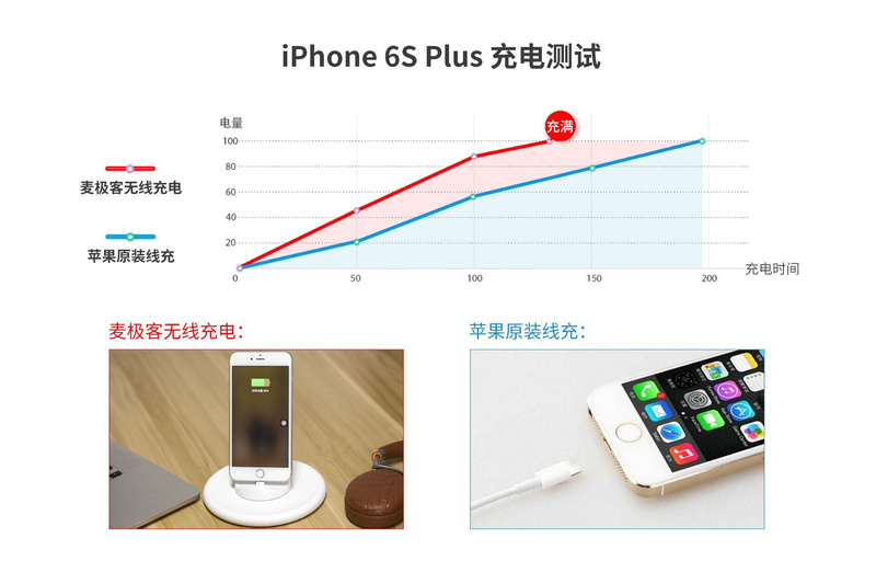 图2 麦极客高功率无线充电与苹果原装线充对比