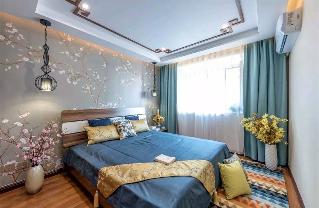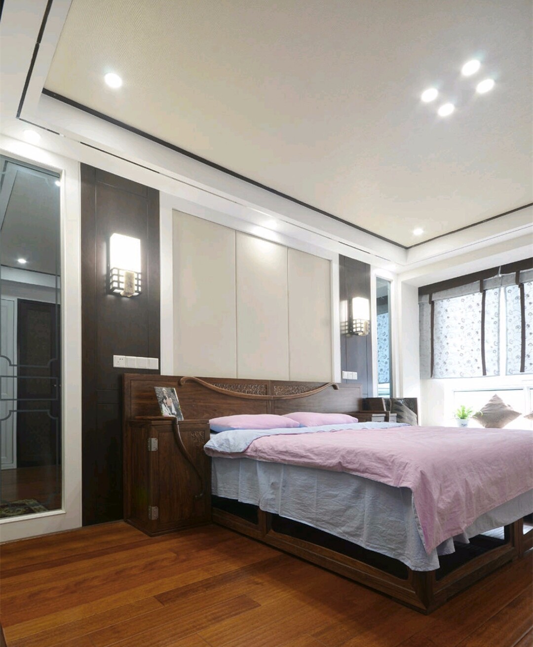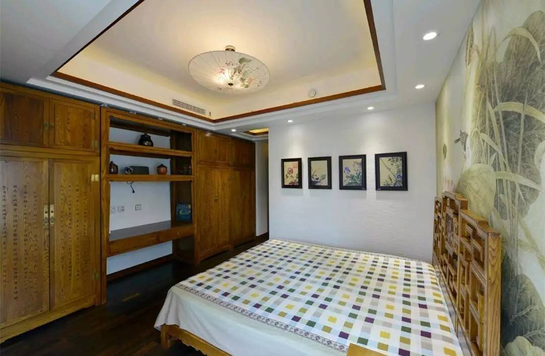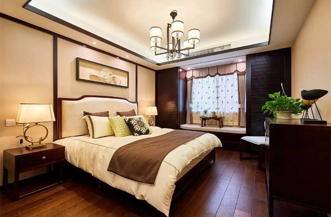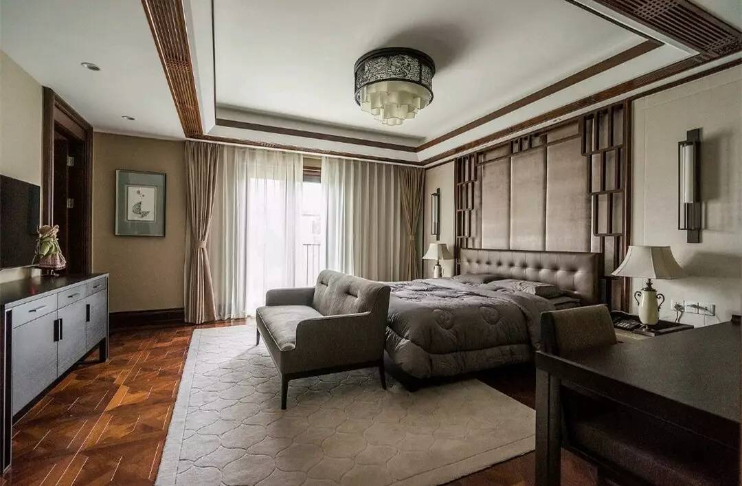 中式的卧室天花,往往也是以庄重典雅为主,与客厅一样采取多级吊顶,通过木线收边来增强空间的立体感与层次感,这样既显得庄重典雅,而且视觉上也可以让空间显得更加宽敞大气,让躺在床上的人休息时更加安心轻松;
