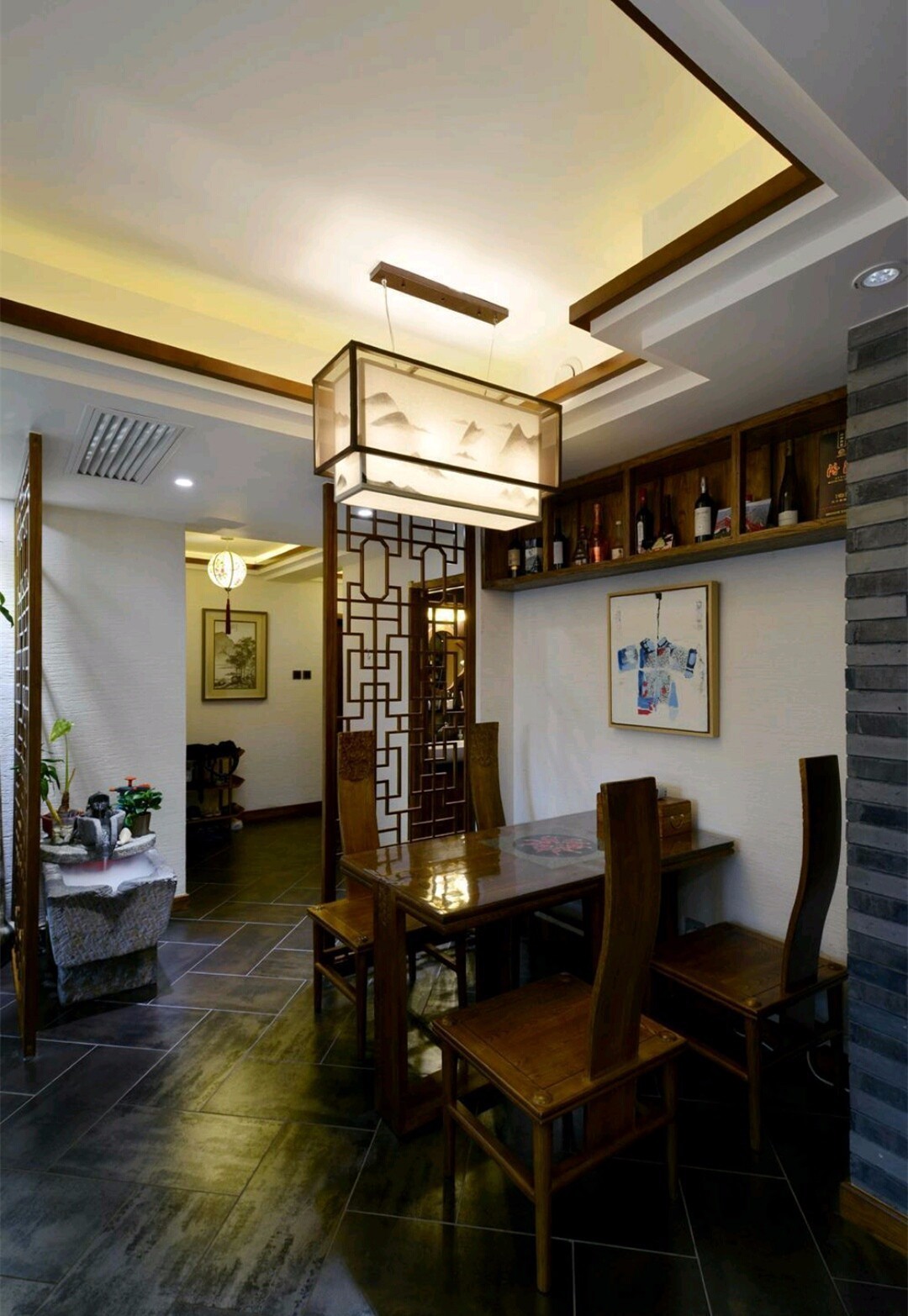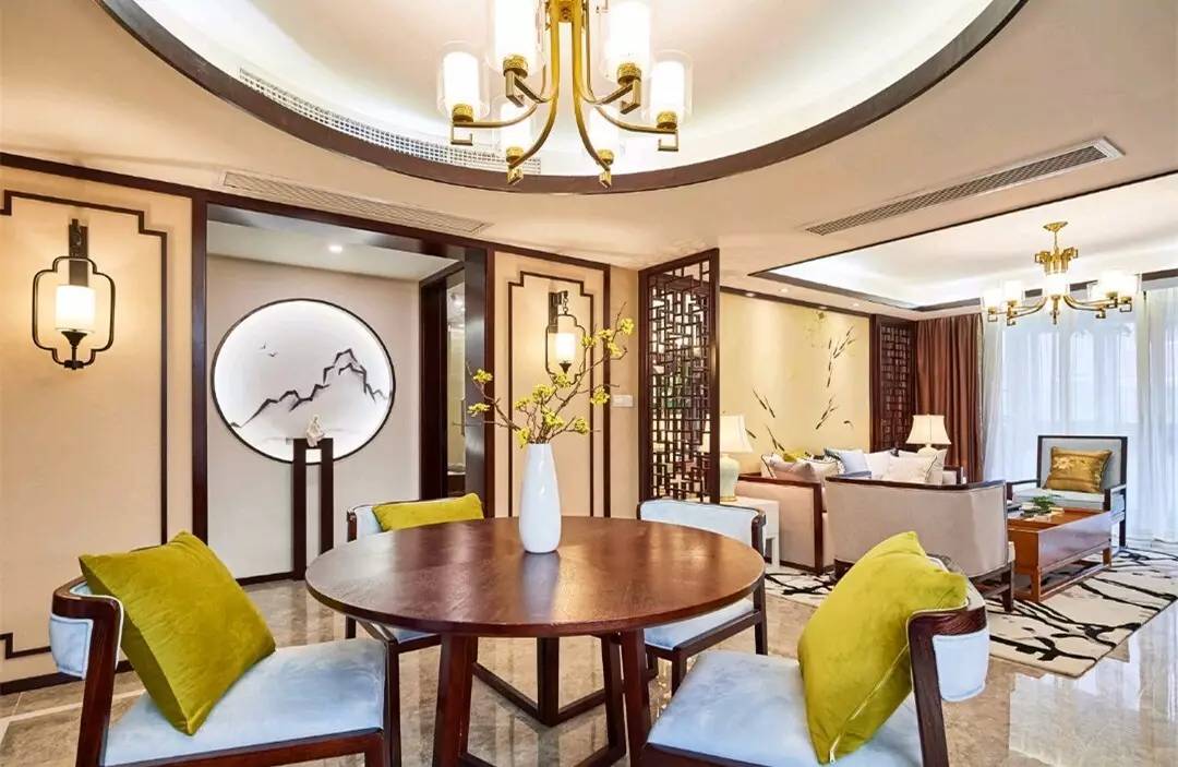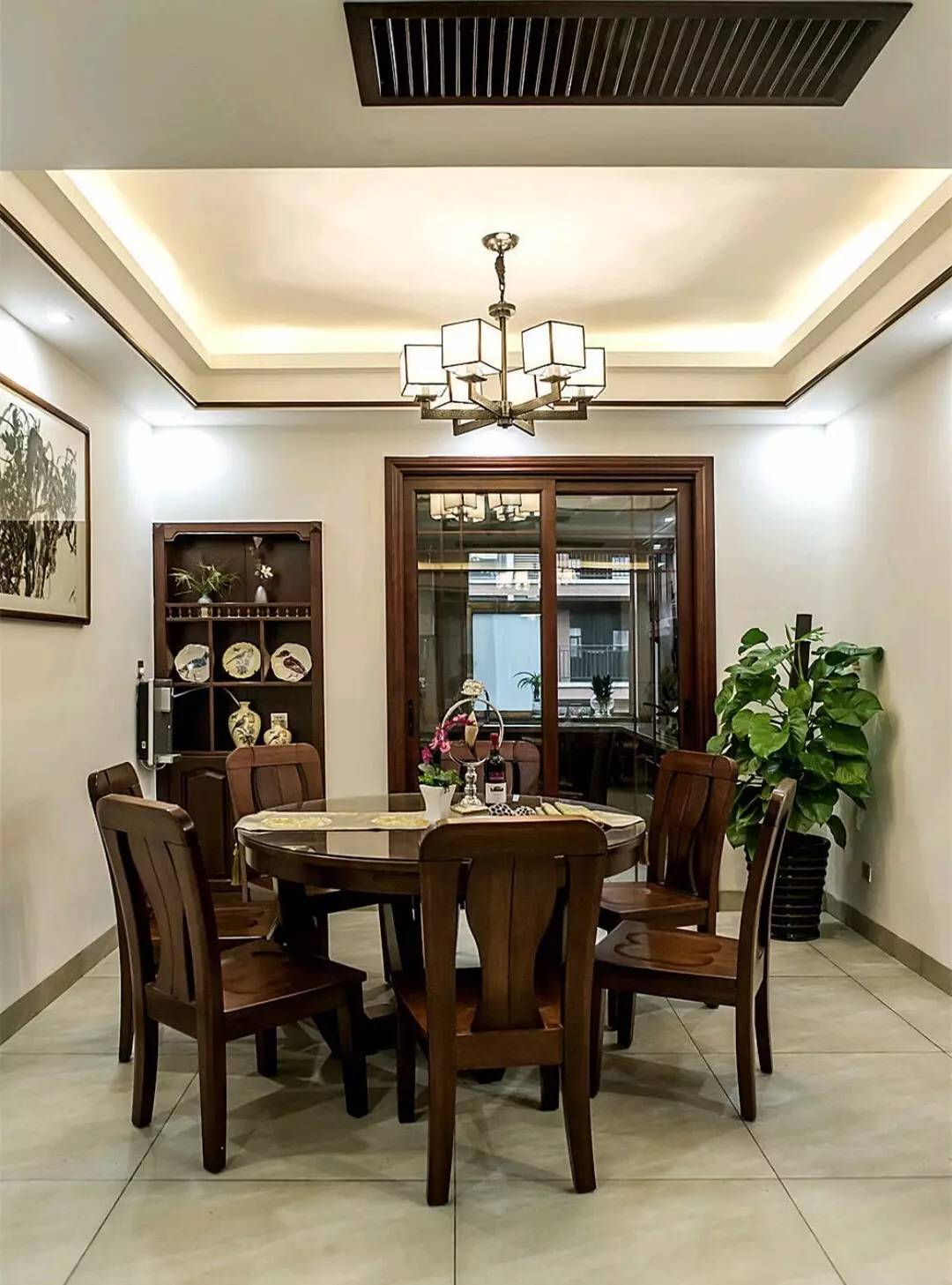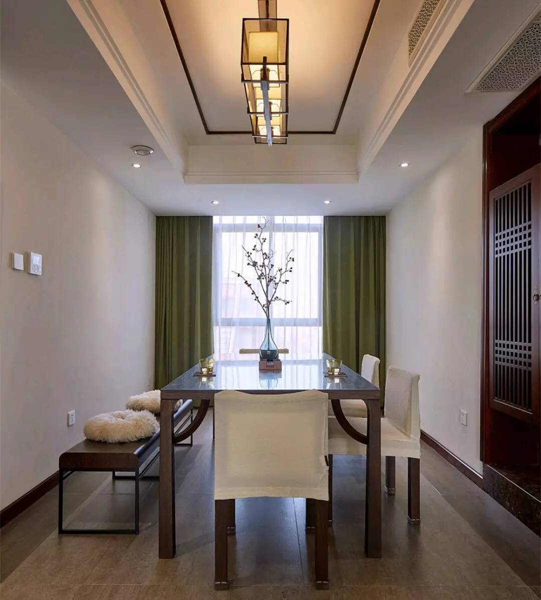 中式的餐厅有方形与圆形的吊顶方式,方形的做法与客厅大致雷同,而圆形的话一般就是在圆边上做木线条收边,这样做可以让这个圆形的吊顶显得更有层次感,而且木质的收边也可以让空间显得更加有中式的味道;