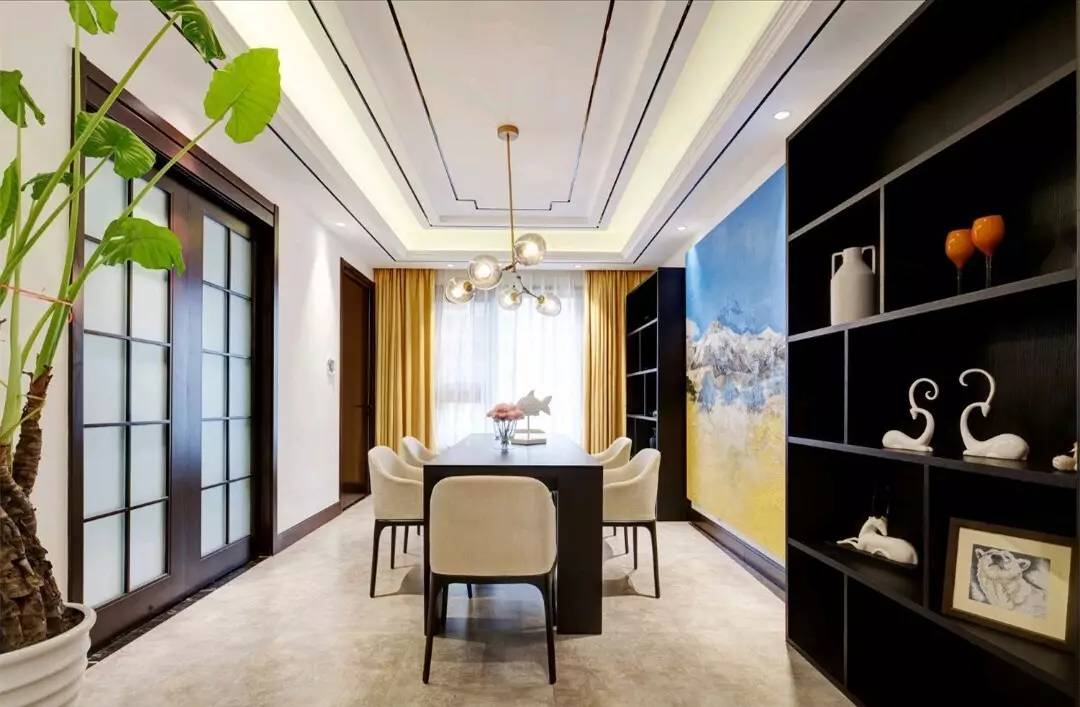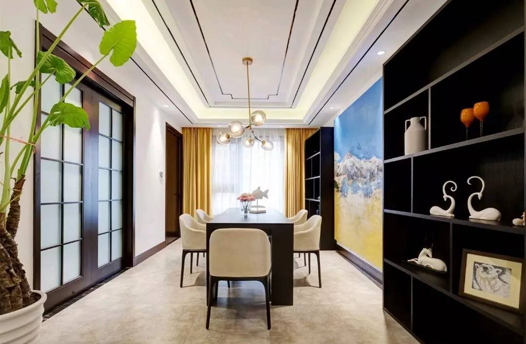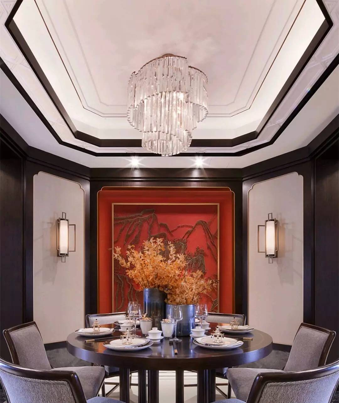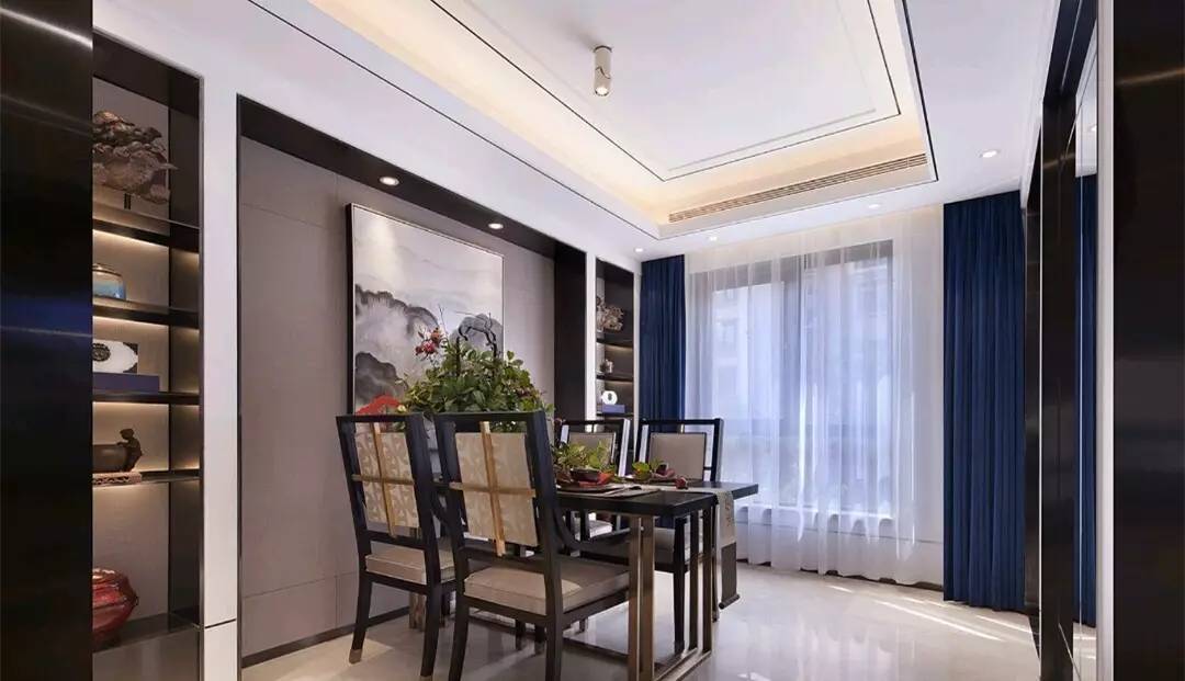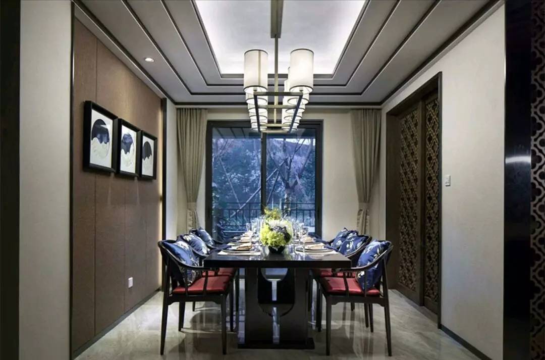 中式的餐厅有方形与圆形的吊顶方式,方形的做法与客厅大致雷同,而圆形的话一般就是在圆边上做木线条收边,这样做可以让这个圆形的吊顶显得更有层次感,而且木质的收边也可以让空间显得更加有中式的味道;