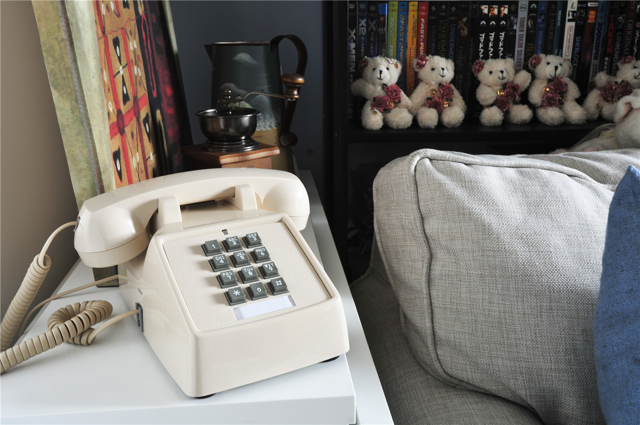 ▼沙发的边柜上摆放着一台复古的电话机;