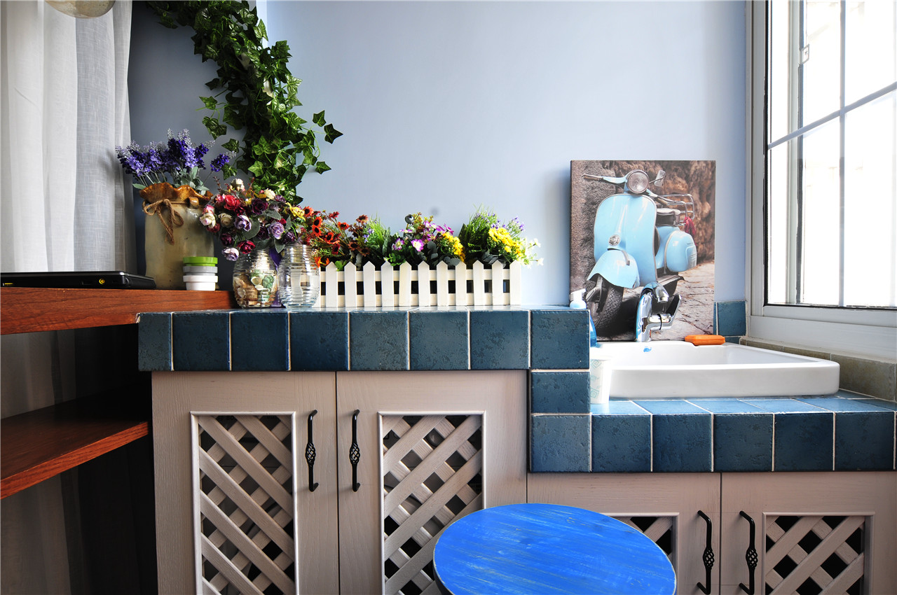 ▼阳台的设计,偏向田园风格,砖砌台面,花架,还有柜门等,处处透露着田园的味道,洗衣机藏在里面用门板挡住,更加美观;
