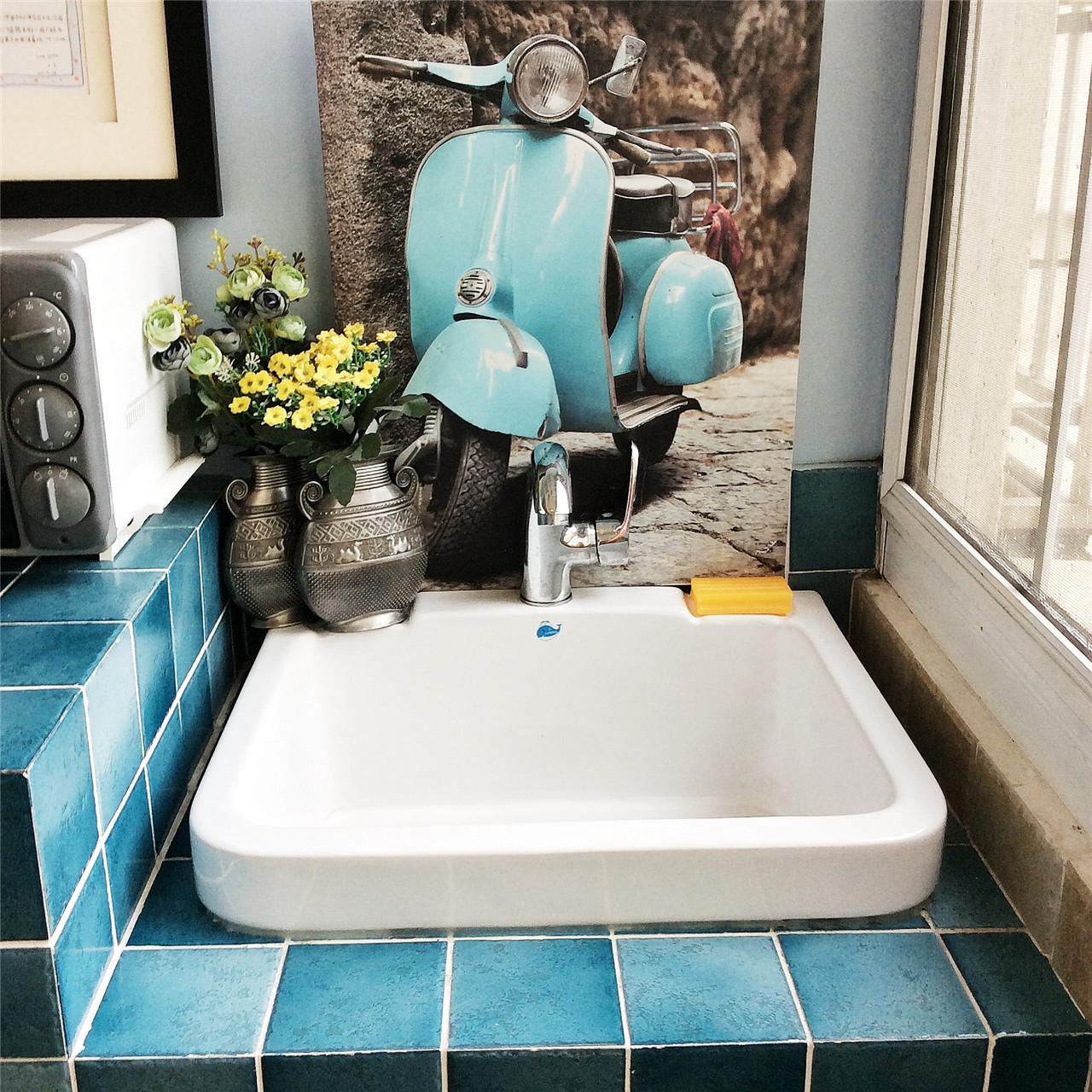 ▼马赛克洗手台面,色彩丰富,铺贴出来的效果时尚又好看,重要的还有个优点是不宜被刮花,即时刮花了也容易修复;