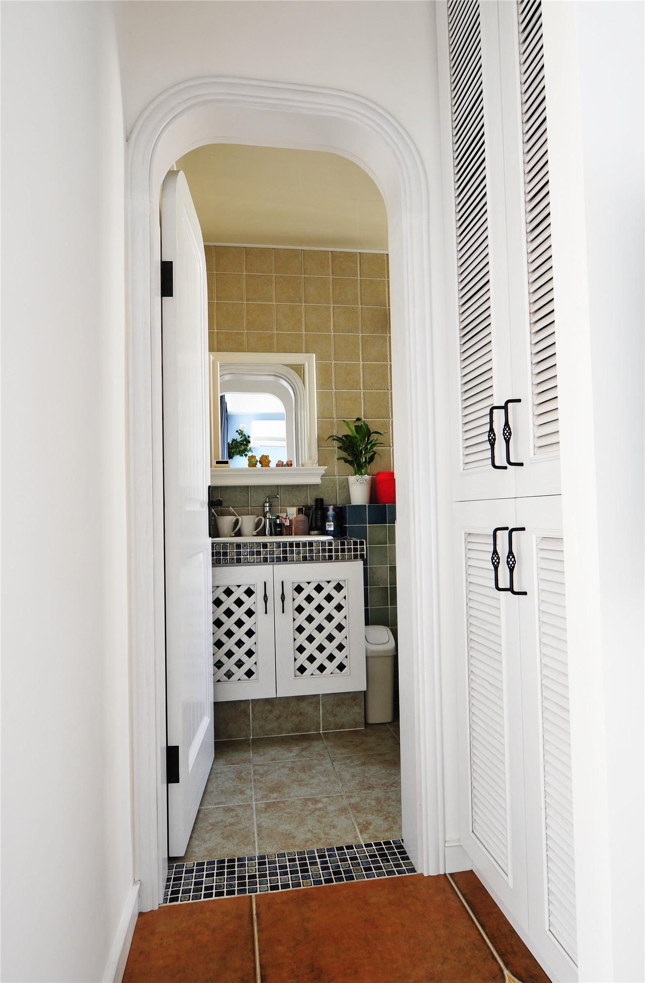 ▼走廊看向卫生间,门口做了一个收纳柜,解决了收纳的问题;