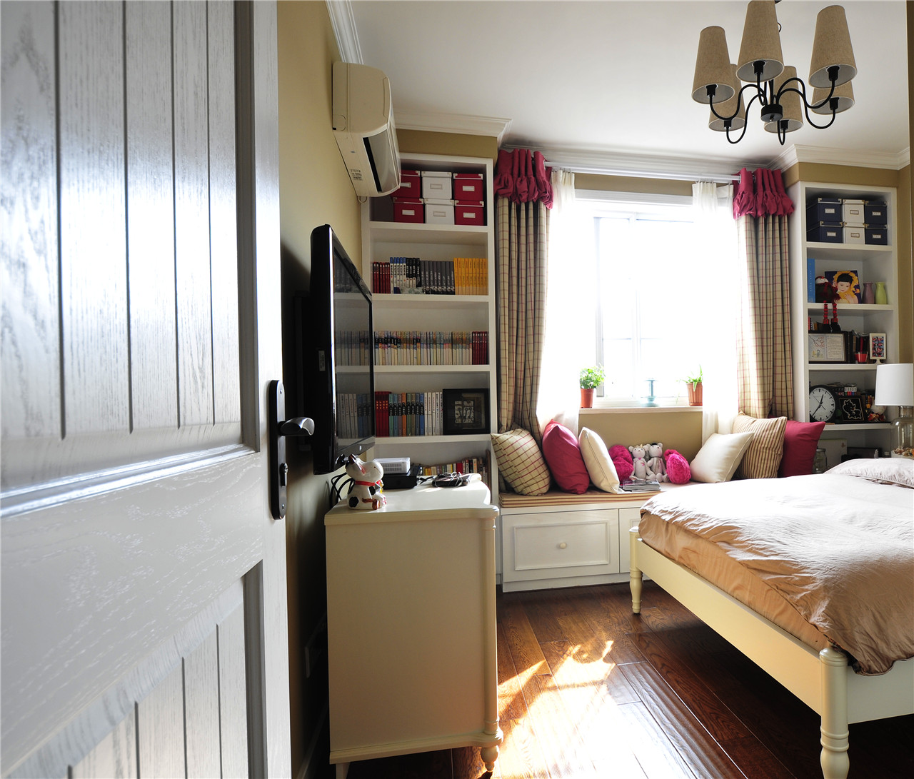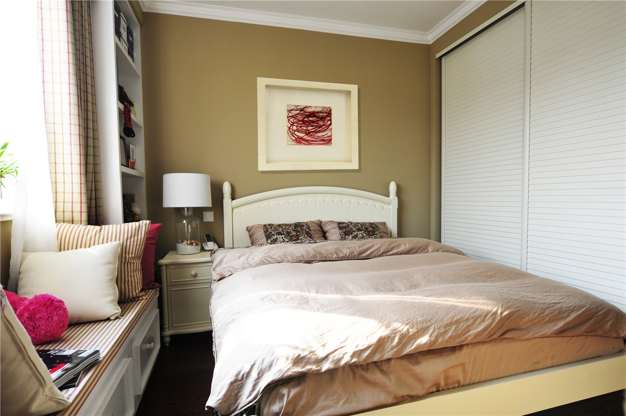 ▼卧室,黄色的乳胶漆,粉色的床上用品,白色的家具如衣柜、床还有飘窗柜等,然后再搭配格子的窗帘等,原来这些颜色组合出来的卧室这么温馨,好看;