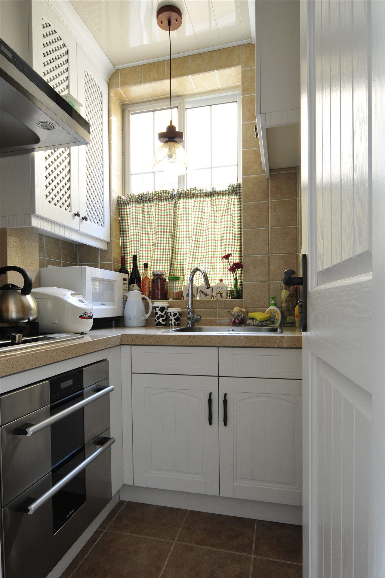 ▼也许很多的小厨房只能摆的下洗菜盆和灶台,但是在这里,小户型L字型厨房设计,不仅洗菜盆和灶台摆下去了,同时还可以摆放微波炉、电饭煲等,重要的还内嵌了一个消毒柜,还有两个吊柜用于收纳,可谓是“麻雀虽小五脏俱全”呀!