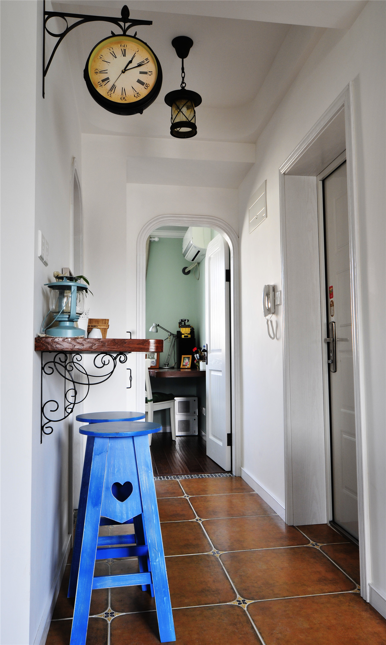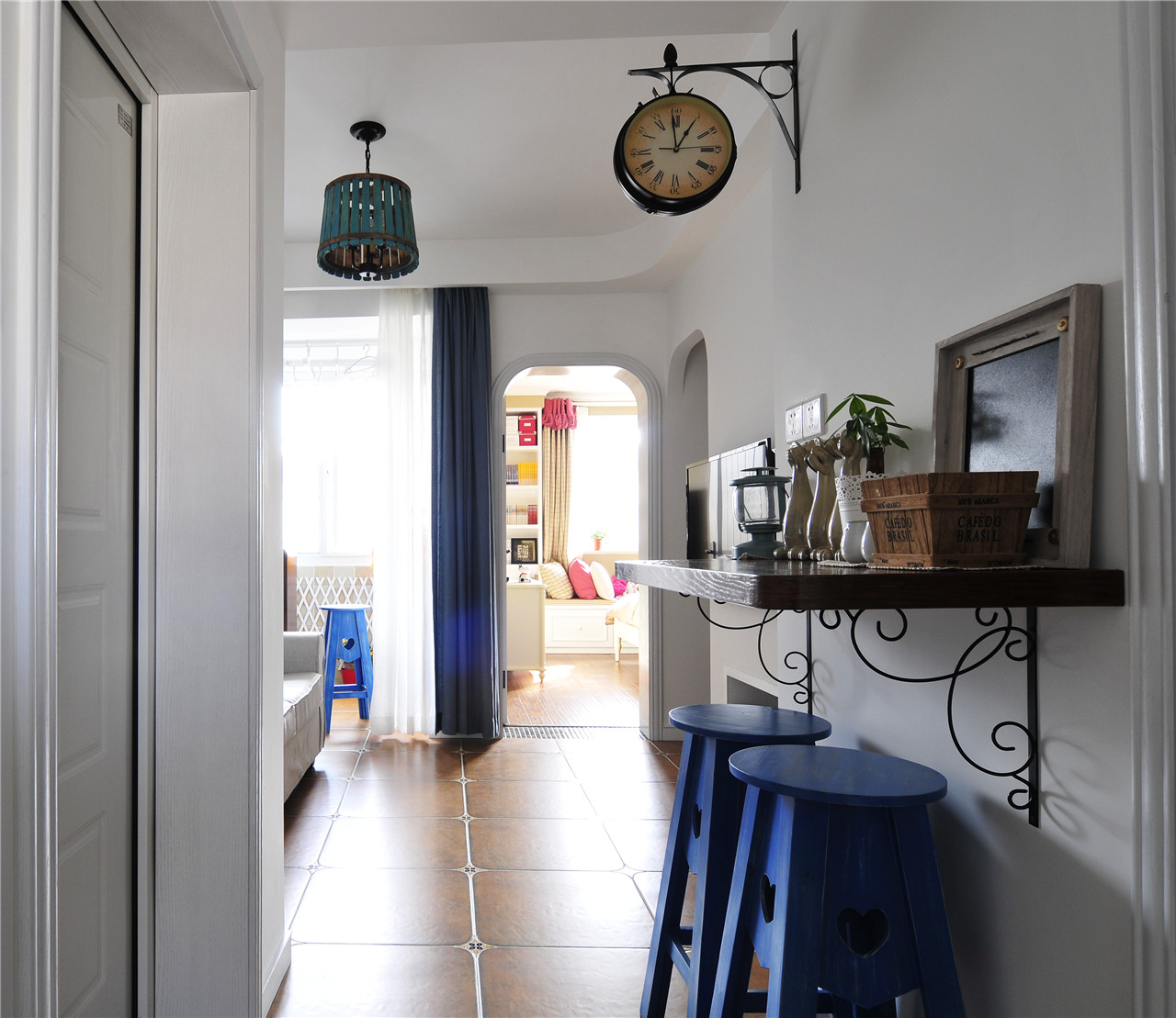 ▼入户大门打开,直对的是吧台区域,墙壁上还挂着一个复古的铁艺挂钟;