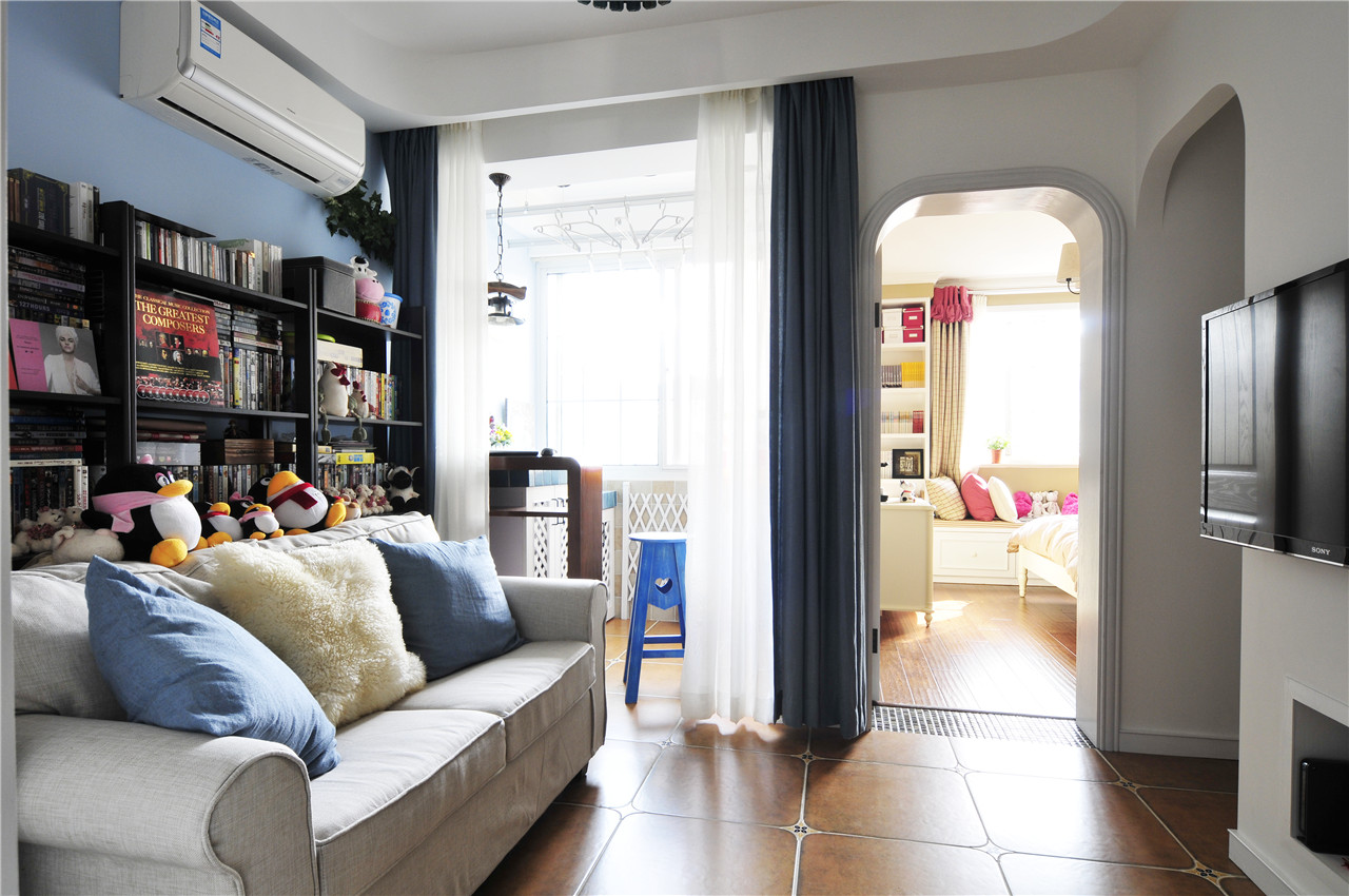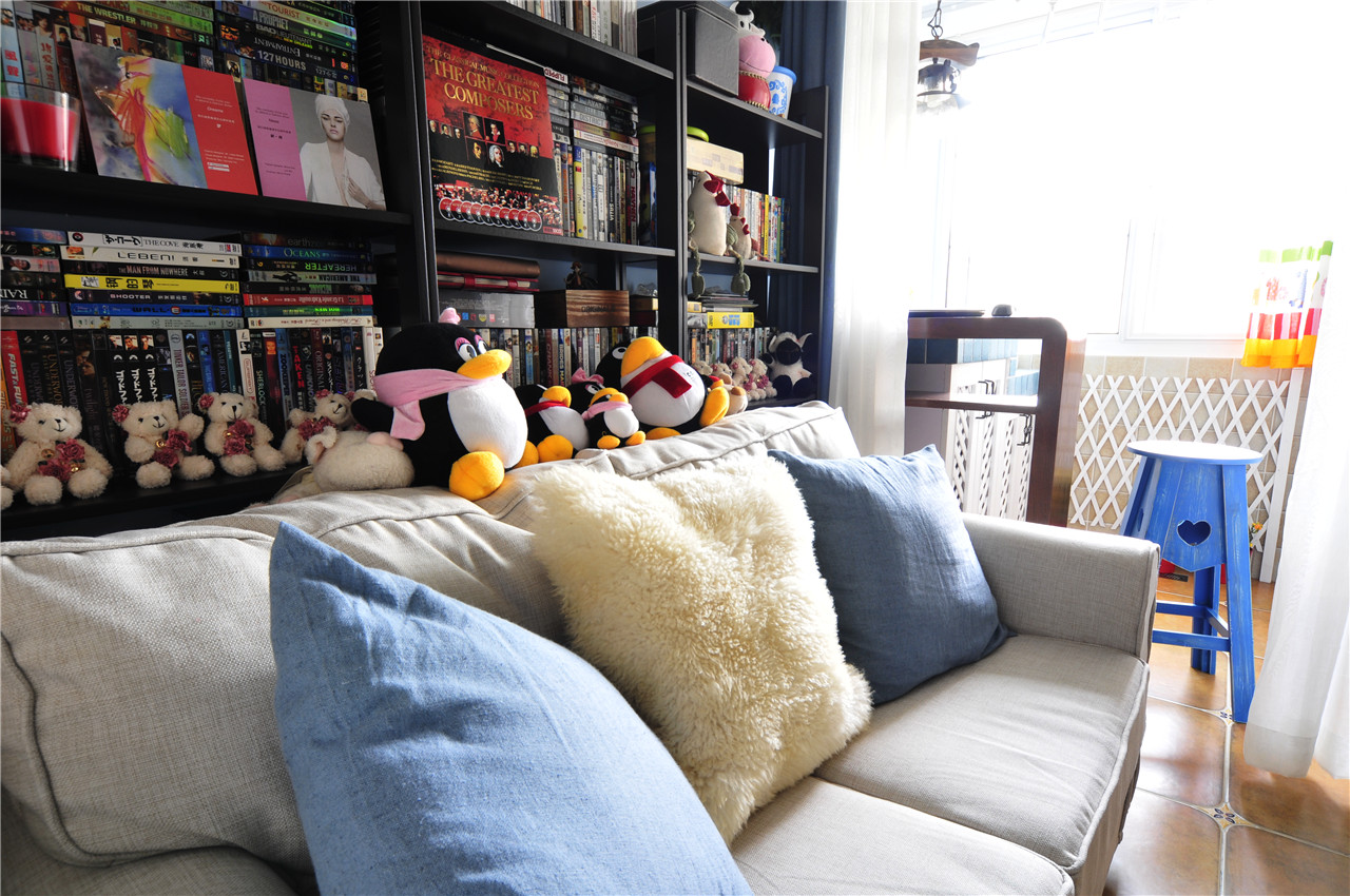 ▼舒适的沙发,背后的书柜摆放着满满的书籍,还有小熊企鹅公仔,一个很可爱、舒适、休闲的客厅,对于忙碌了一天的人来说,回到这个这么温馨、舒适的家里是多么幸福的事;
