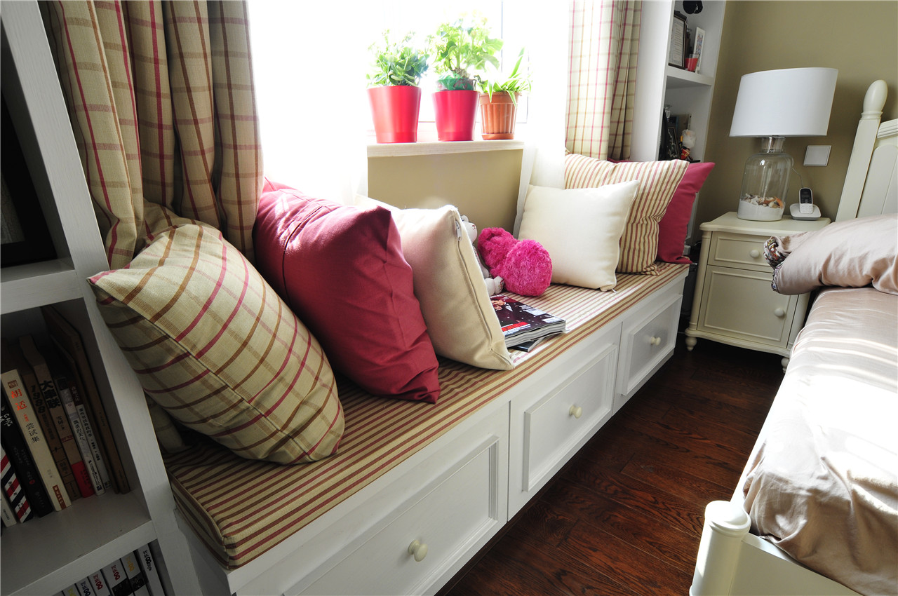 ▼飘窗柜,两边做成书柜,中间就着窗户的尺寸做成可坐人的抽屉柜子,实现分类收纳功能,而且搭配上舒适的抱枕及坐垫后,窗台再摆放三两盆绿植,一个舒适,小清新的休闲角落就这么出来了;