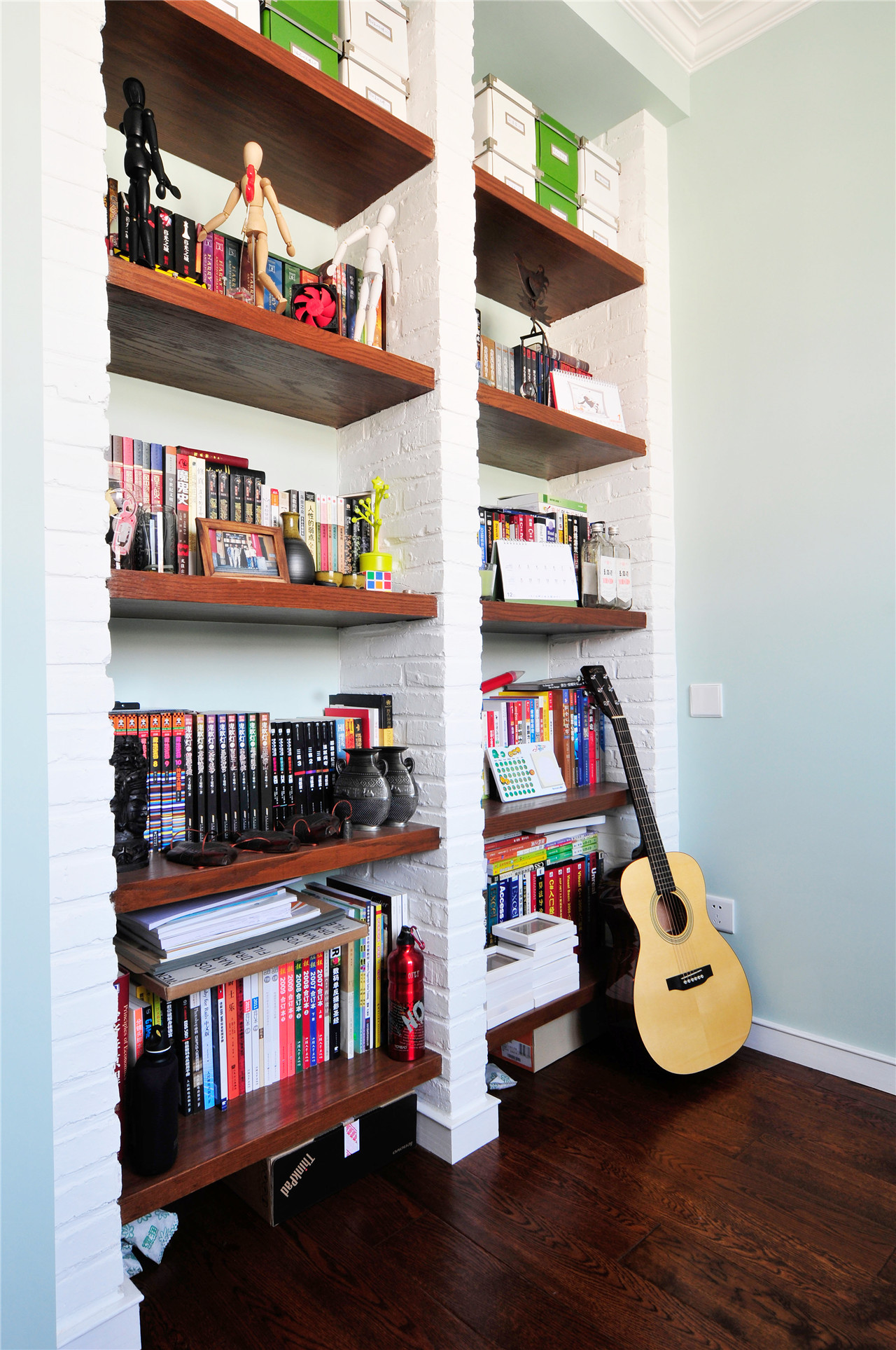 ▼白砖与木隔板砌出来的书柜,很有乡村气息,又很有文化气息,耐看!其次是,很实用!!