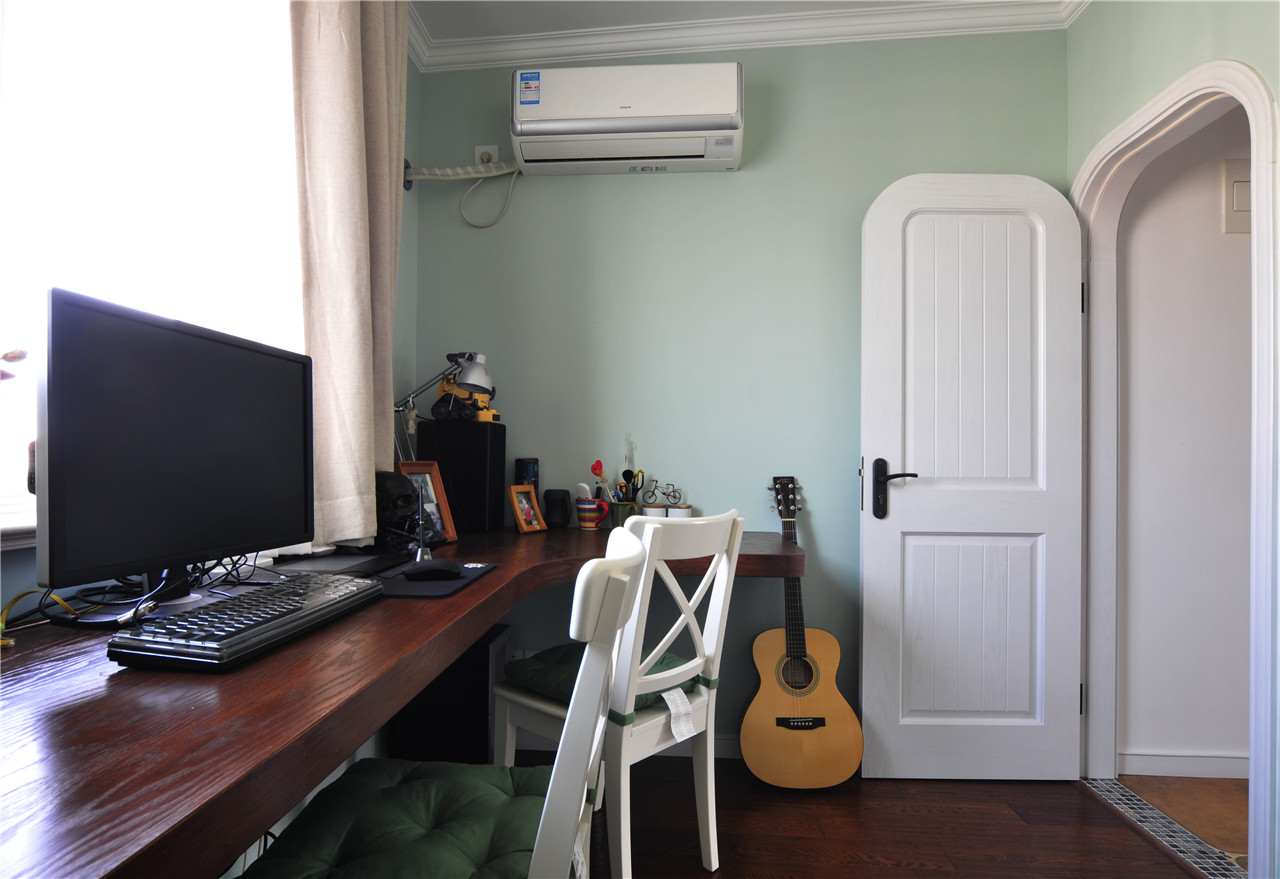 ▼双人位书房,淡绿色的墙面,让人很舒服,书桌挨着窗摆放,对着窗工作,办事效率都高了一倍;