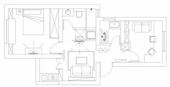 ▼客厅,正对的我们视线的三个门洞对应的空间,分别是:左上角的是阳台洗衣房,正中间的门洞是卧室,右边的即电视背景墙后面的空间是卫生间;