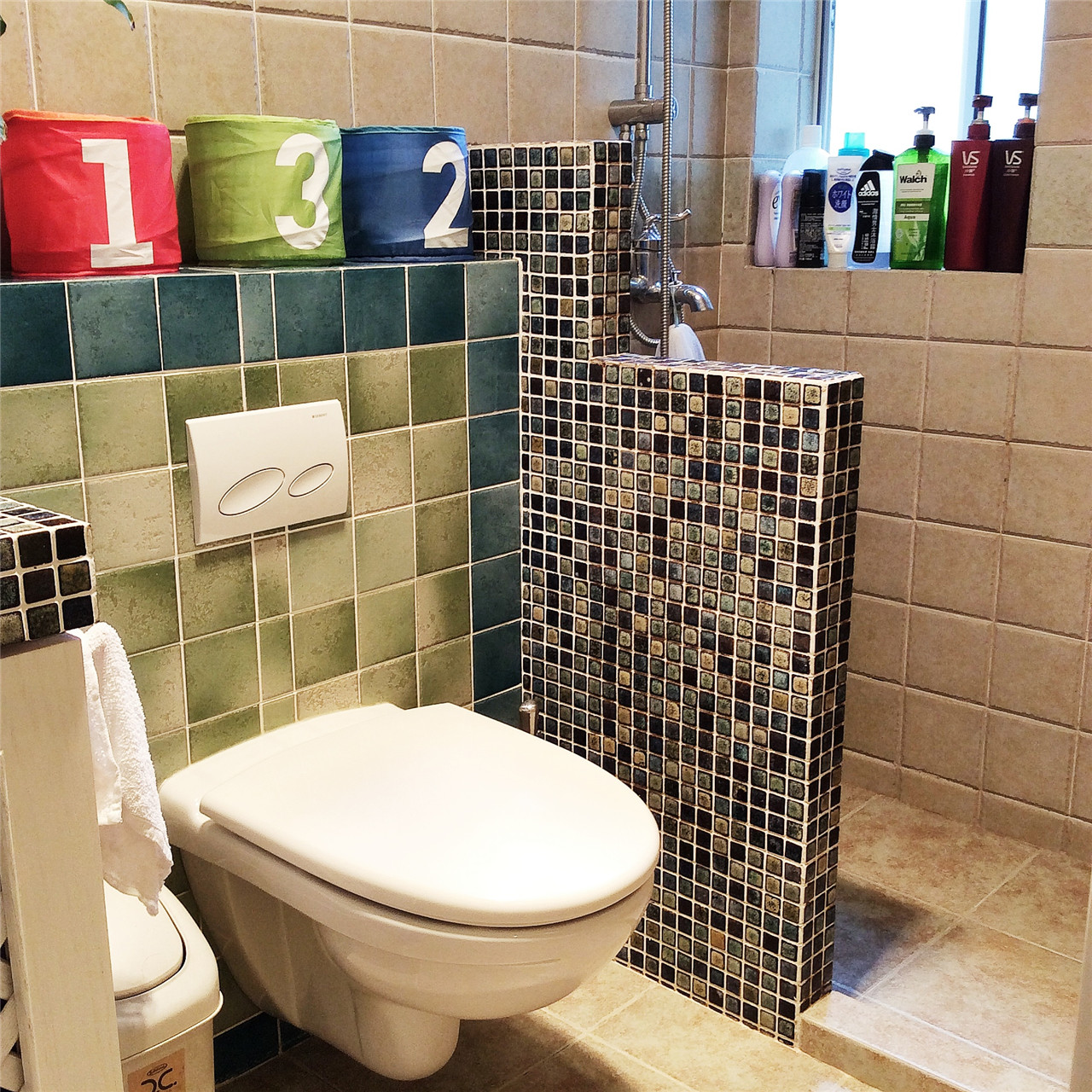 ▼马赛克矮墙作为干湿分离的隔断;