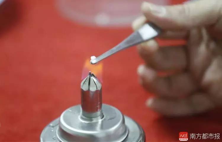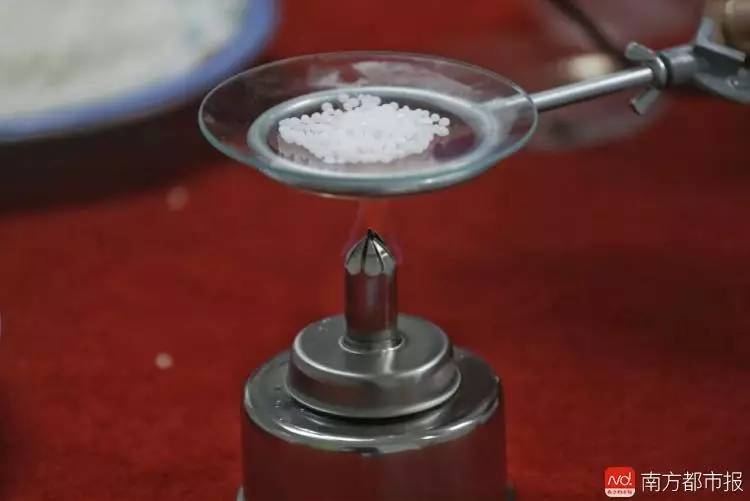 “塑料大米”完全融化,用手一捏,即变成粉末。