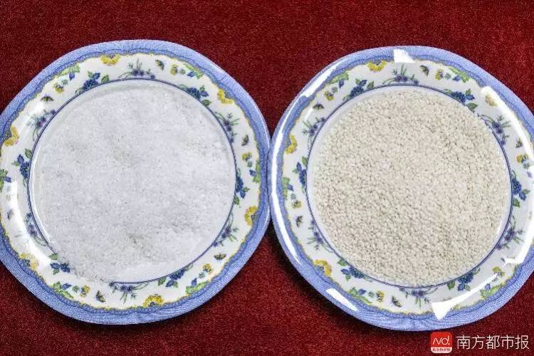 与普通米(上图右)对比,“塑料大米”(上图左)颜色特别白。