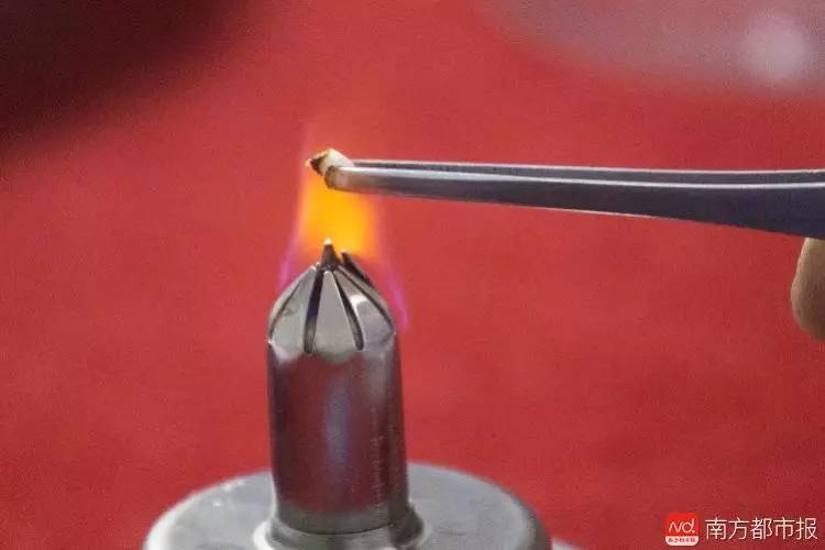 工程师点燃酒精灯,分别用镊子夹取5种材料置于火焰顶部。