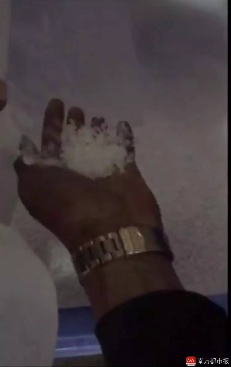 同时,她将所谓的“假米”置于食指与大拇指之间挤压,大米被挤压成乳白色的扁平一小条。