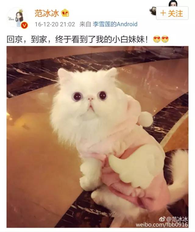 小白妹妹和丑哥作为范冰冰最宠爱的两只猫,在冰冰微博的出镜率比李晨还高。真·人不如猫系列~