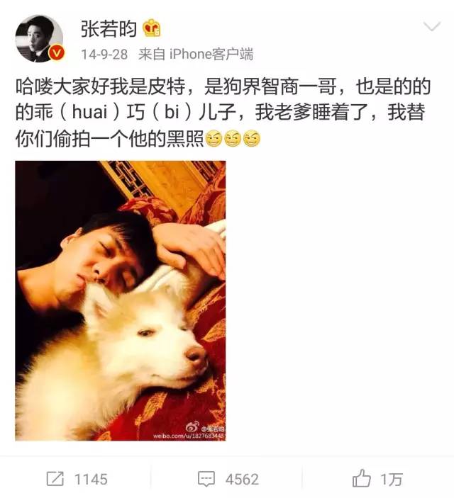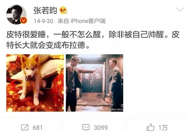 除了张若昀唐艺昕两人用狗狗名字暗暗发糖,章子怡有一次也用狗狗秀了个含蓄低调的恩爱。爱犬小拇哥在她微博上存在感很强的~