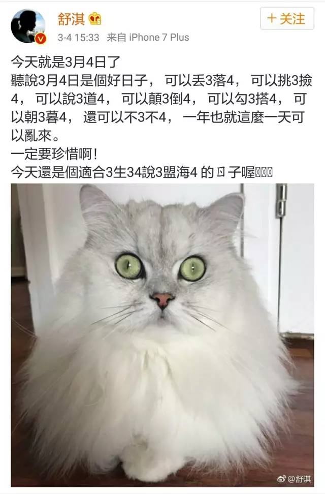 当然,结婚后,舒淇也变成白猫咪的女主人咯~所以现在在舒淇微博上,MayMayboy无法独得恩宠了~