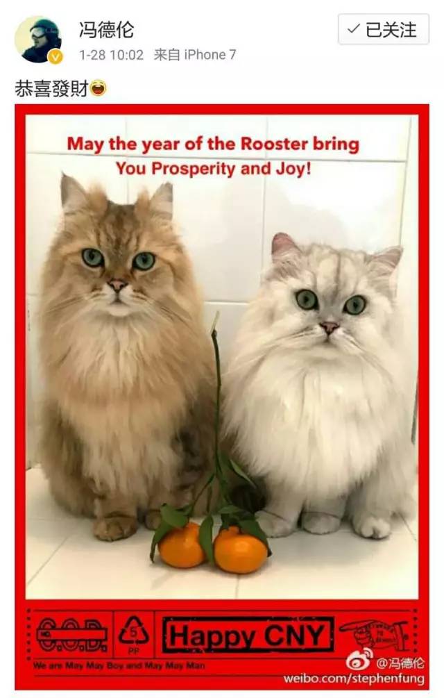 幸亏如今两人大方承认结婚,两个人的猫咪又重新在微博上线咯!新年的时候,冯德伦晒出自己的白喵和舒淇的MayMayboy,祝大家新年恭喜发财~