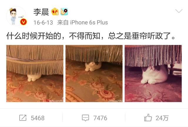 去年六月,他发微博,内容是一只猫猫钻到床帘底下了