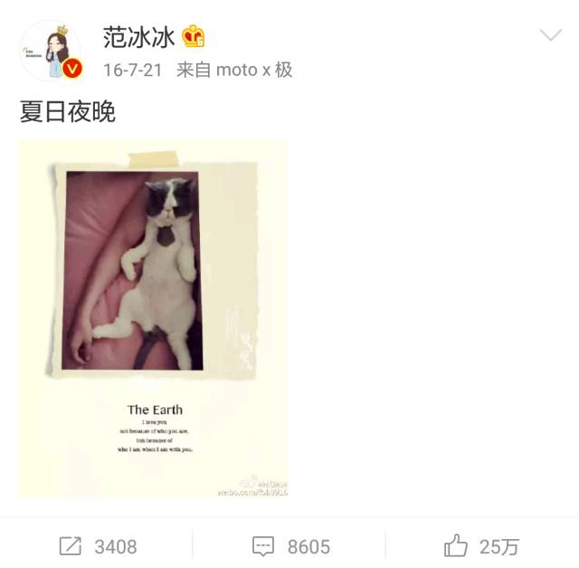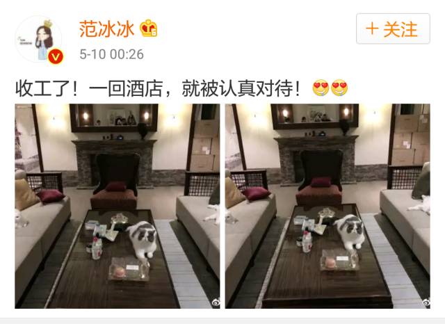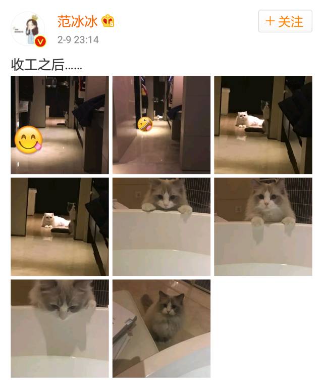 范冰冰的微博内容,除了工作和自拍,就是日常晒猫。