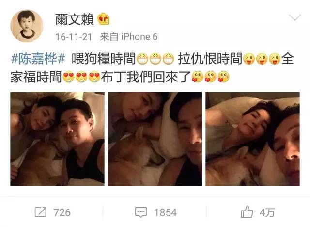 比如晒两人跟布丁的全家福,语气超自豪超拉仇恨