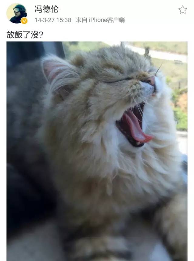 而且第二天,冯德伦竟然在微博上回应了!他晒出的是自己那只白猫,配文是:放饭了没?显然是有意跟前一天的“men’s dinner”对应